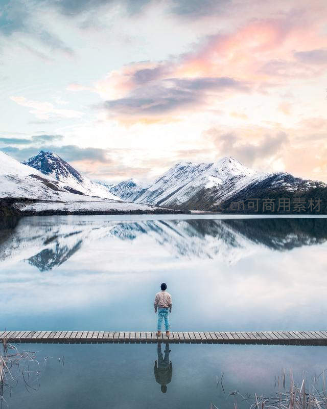 一位旅人背对镜头,静静伫立于延伸至湖心的木栈道上,凝望着远方被霞光染红的雪峰和如镜面般倒映着天空的湖水,尽显天地间的宁静与辽阔。