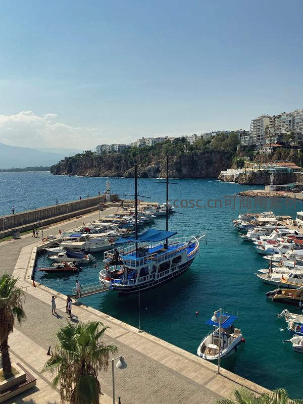 阳光明媚的地中海港口,碧蓝海水环绕着停泊的各色游艇,岸边是依山而建的城市建筑和棕榈树,展现出一派悠闲惬意的度假风情。
