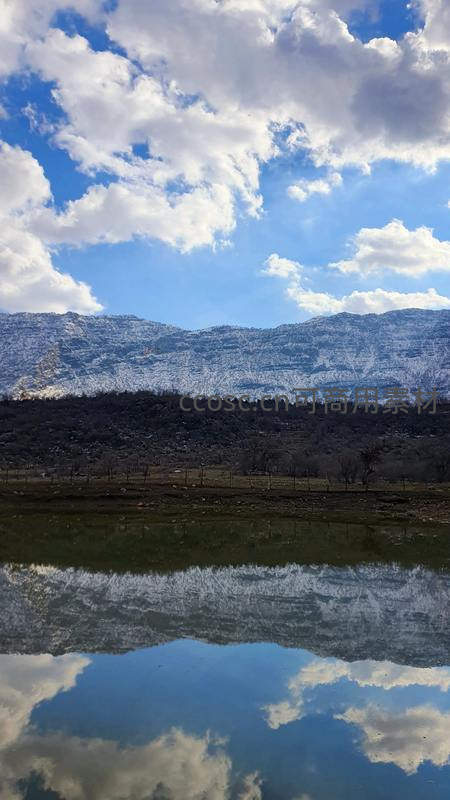 蓝天白云下,覆盖着薄雪的山峦与飘逸的云朵一同倒映在前方的水塘中,前景是静谧的田野,整个画面充满了宁静祥和的诗意美感。