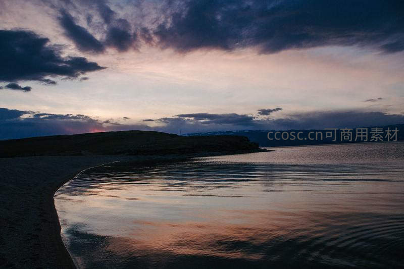暮色降临,厚重云层被夕阳染成紫红,其倒影在微澜海面上摇曳生姿,沙滩边缘静静延伸,勾勒出一天终章的壮丽与温柔。