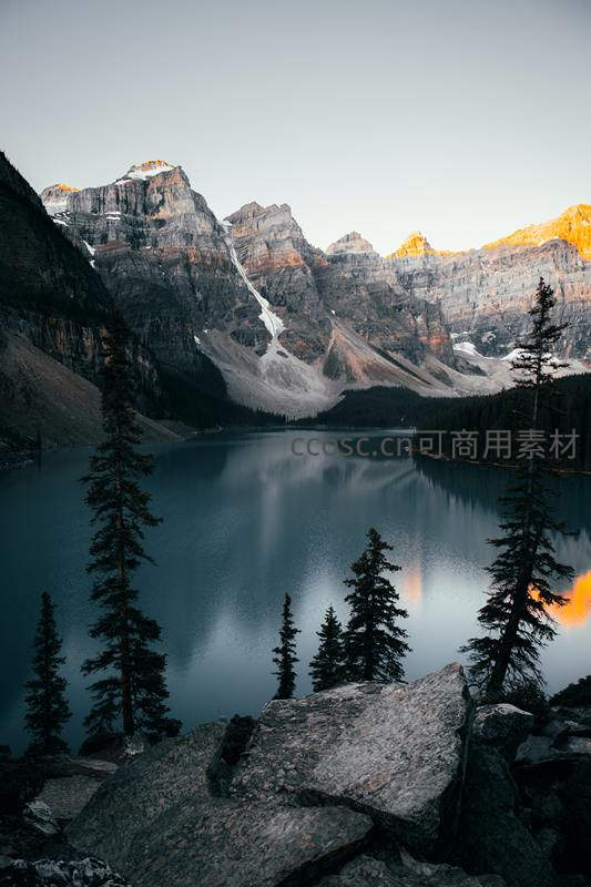 冰川湖畔松林立,远山夕照染金边