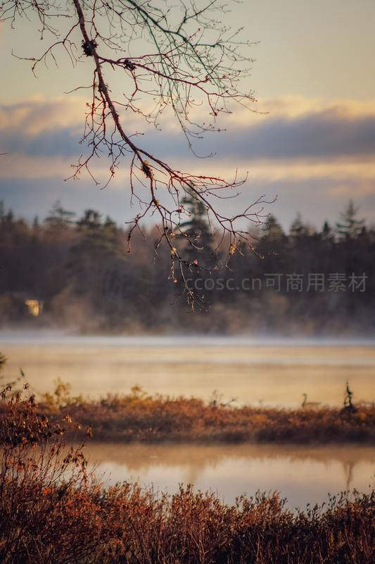 清晨薄雾轻笼湖面,前景中一枝光秃的树枝在柔和霞光下形成优雅剪影,远处树林朦胧,整个画面充满宁静、朦胧的诗意美感。
