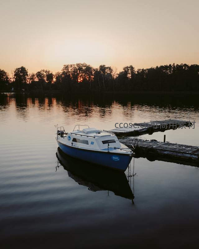 一艘蓝白小船静静停靠在木质码头旁,水面倒映着天边晚霞与树影,整个场景安详而富有诗意,适合悠闲度假时光。