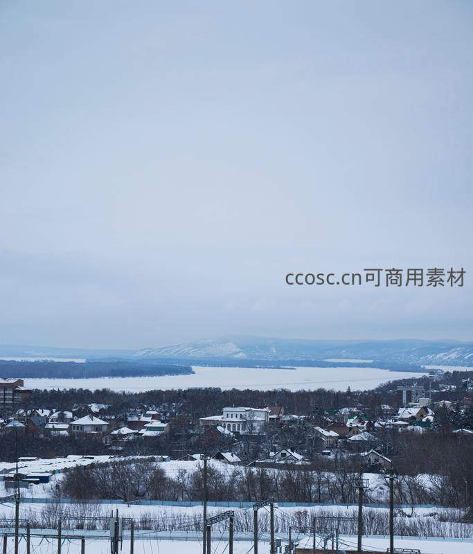 白雪覆盖的宁静小镇依偎在冰封的湖畔,远处是层叠的山峦,在灰蓝色天空下构成一幅静谧而壮阔的冬日画卷。