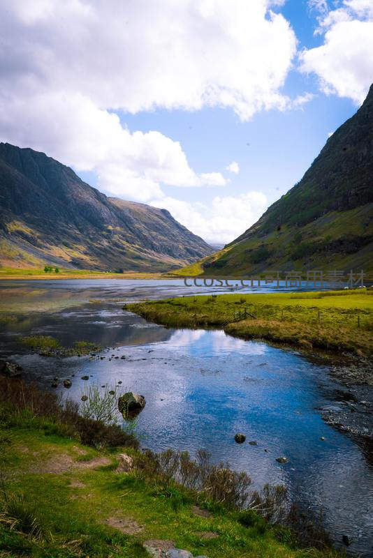 一条清澈的溪流在翠绿的山谷中蜿蜒流淌,两侧是陡峭的山峰,天空中飘着蓬松的白云,景色壮丽而充满生机。