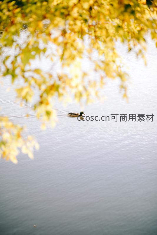 一片金黄的秋叶从前景垂下,虚化了焦点,一只野鸭正悠闲地划过平静的湖面,留下一道涟漪,画面充满诗意与宁静。