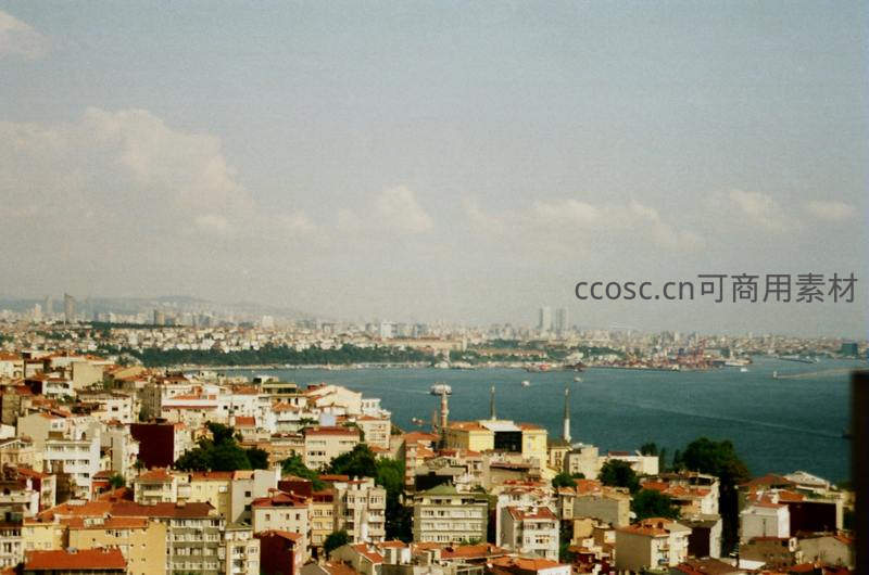 从高处俯瞰,密集的红顶建筑群沿岸铺展,远方是繁忙的海港与现代高楼,蓝天白云下展现一座滨海城市的独特魅力与活力。