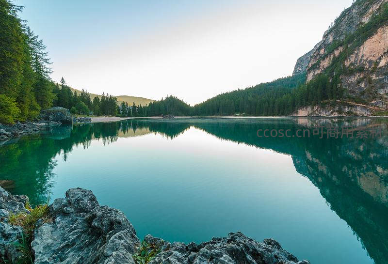 澄澈的湖水如镜般倒映着两岸苍翠山林与陡峭岩壁,前景粗犷岩石增添野趣,晨光柔和,整个场景宁静致远,令人心旷神怡。