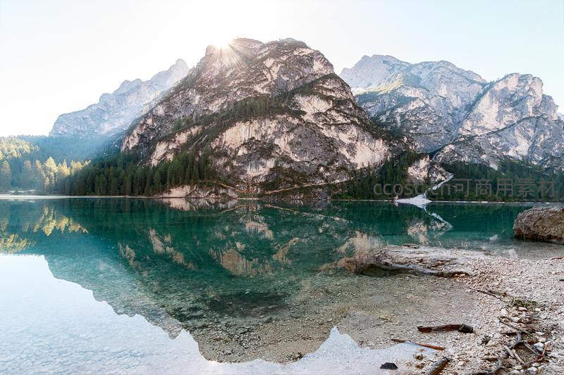 朝阳初升,金色光芒洒在山巅,清澈湖水如镜般倒映群山轮廓,岸边碎石与枯枝点缀,展现大自然最纯净的清晨之美。
