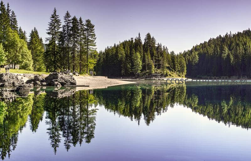 湖岸松林倒影对称,水面如镜无波