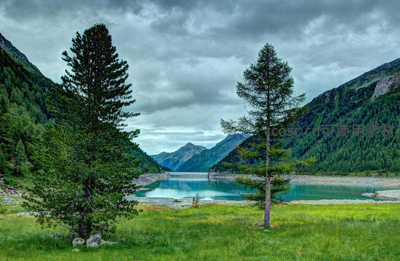 两棵挺拔松树伫立在翠绿草甸上,遥望远方被群山环抱的幽蓝湖泊,厚重云层低垂,为这片原始山谷增添了几分神秘与静谧的自然气息。