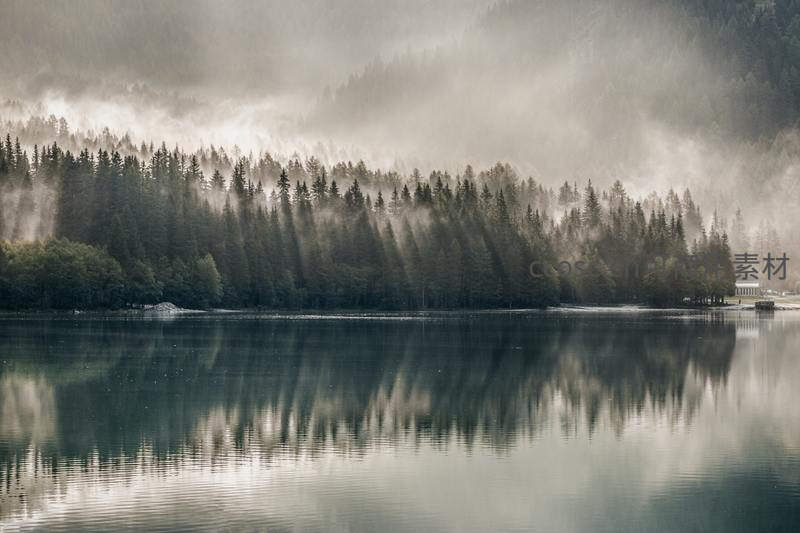 浓雾缭绕于茂密针叶林间,阳光艰难穿透,湖面如镜般倒映着雾中树木轮廓,整个场景宛如仙境,散发着神秘、静谧与超凡脱俗的自然之美。