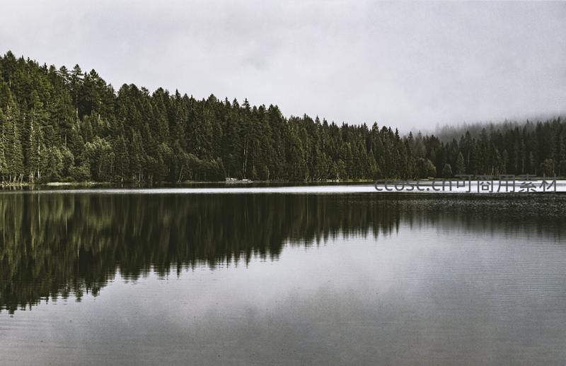 平静的湖水如镜,完美倒映着岸边茂密的针叶林和天空的灰白云层,营造出一种幽深而安宁的氛围。