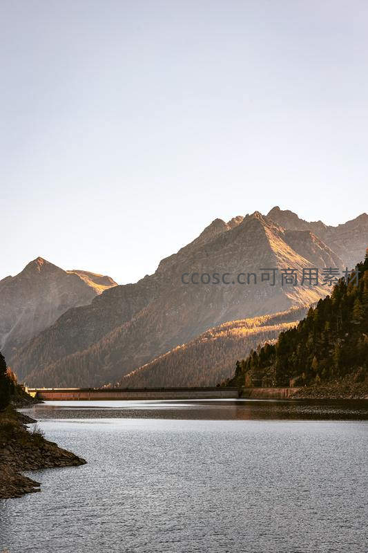 宏伟的大坝横亘于群山之间,平静的库区水面倒映着被夕阳染成金黄的山体,展现人与自然和谐共存的壮丽景象与宁静氛围。