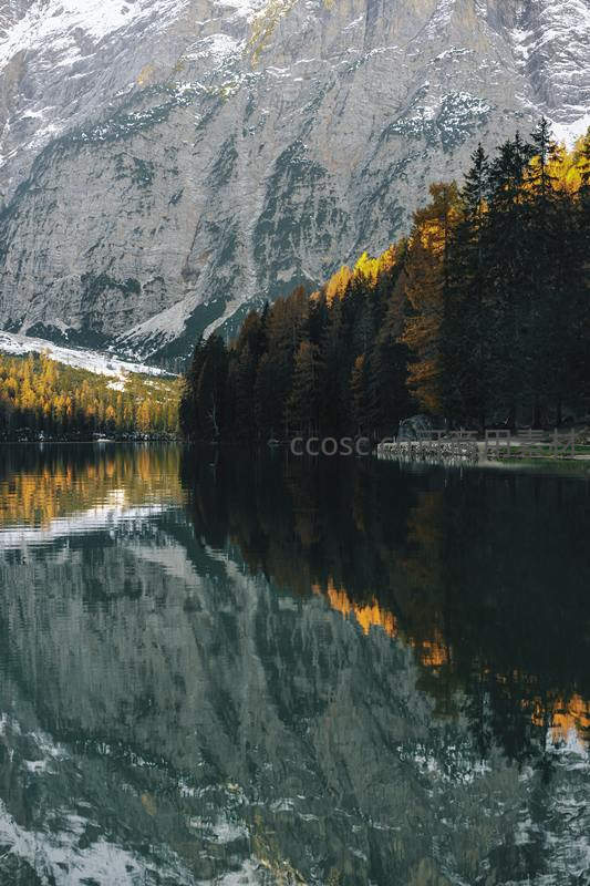 陡峭岩壁下的湖面平静如镜,完美倒映着层林尽染的秋日山林与嶙峋山体,斑斓色彩交织,构成一幅气势恢宏又细腻动人的自然画卷。