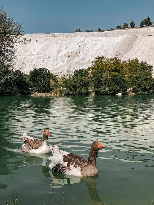 两只灰白相间的鹅悠游于碧绿湖面,身后是层层叠叠的白色石灰岩峭壁,构成动静结合的和谐画面。