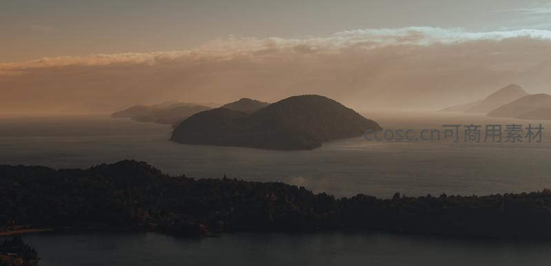 薄雾笼罩群岛,夕阳染金海面