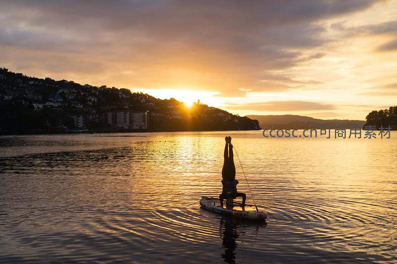 金色夕阳洒满湖面,一人在桨板上优雅完成倒立瑜伽动作,远处山坡上的建筑群与天边云霞交相辉映,尽显动静结合之美。
