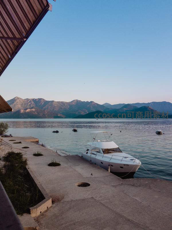 白色游艇安静地系在混凝土码头边,远处连绵山脉倒映在平静海面上,天空湛蓝无垠,整个画面散发着悠闲惬意的度假气息。