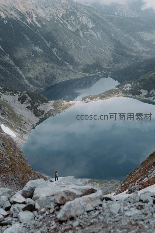 站在高耸山崖之上,俯视深谷中如镜的湖泊与连绵山脉,一人身影衬托自然之宏大,展现户外探险者征服自然的豪情与敬畏。