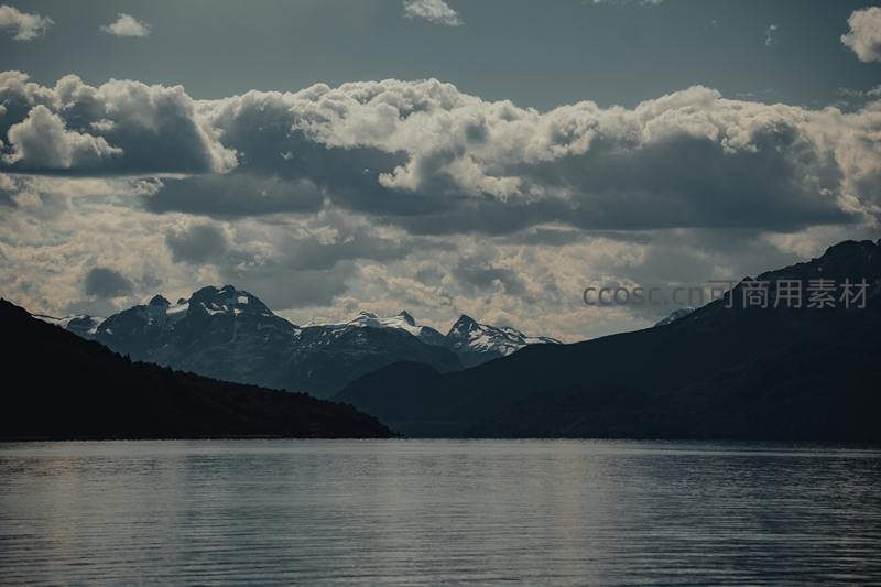 雪山倒影湖面,云层低垂如画