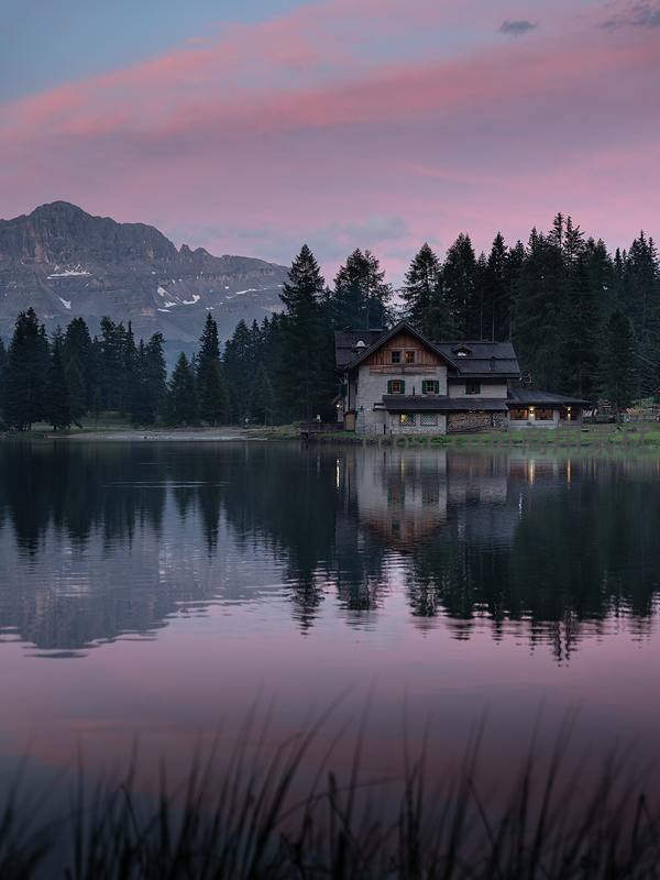 粉紫色晚霞下,一座传统木屋静卧湖畔,四周松林环绕,水面倒影清晰如镜,前景芦苇轻摇,构成一幅宁静而诗意的山水画卷。