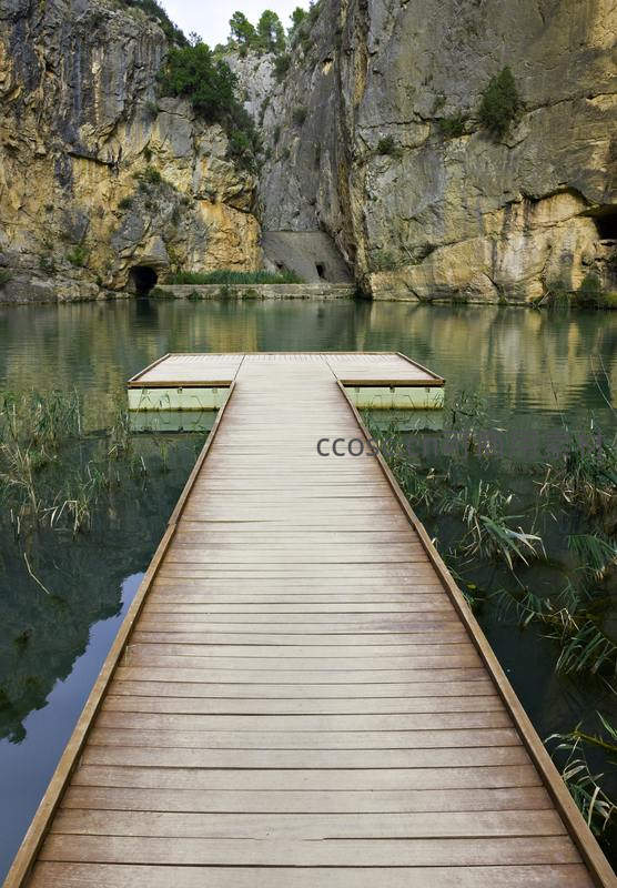 一条木质栈道从前景延伸至幽深峡谷中的静谧湖面,两侧峭壁高耸,绿植点缀其间,水面清澈倒映岩壁,营造出远离尘嚣的秘境感。