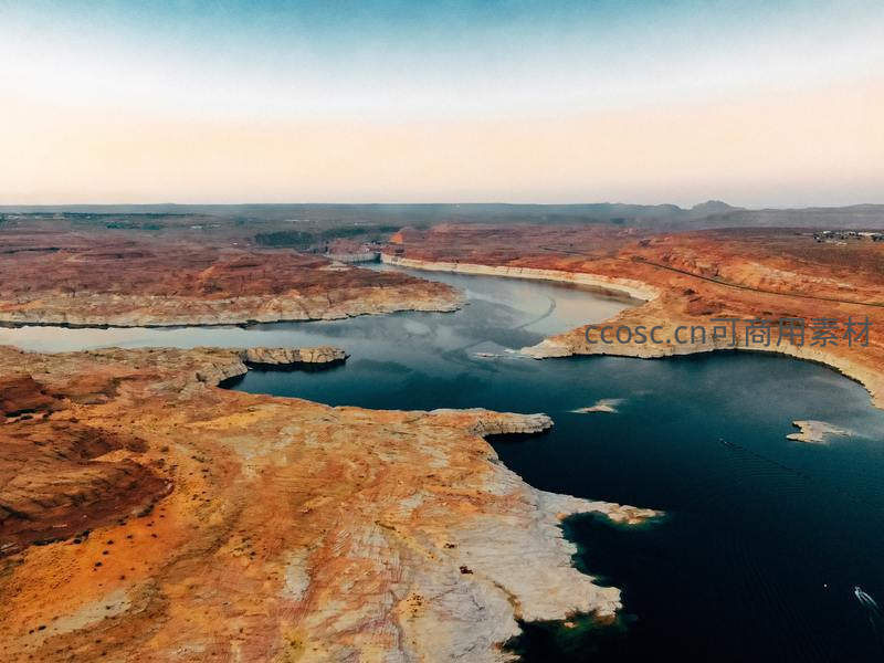 从高空俯瞰,深蓝色的水库如丝带般穿梭在广袤的赭红色峡谷岩层中,水面平静倒映着天空,展现出壮丽而宁静的自然地貌景观。