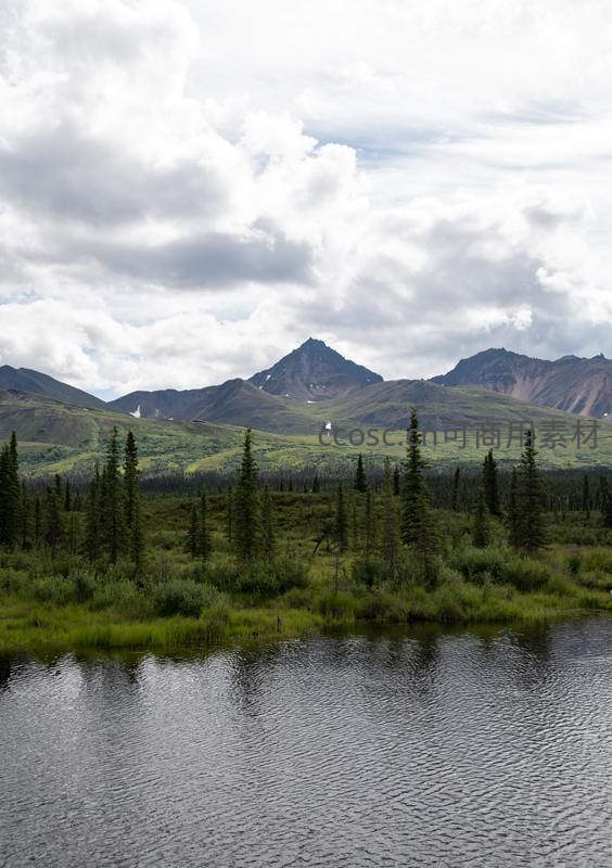 多云天空下,连绵青山与茂密针叶林环绕着波光粼粼的湖面,展现出原始而宁静的北国湿地风光。
