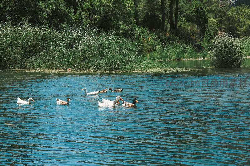 碧波荡漾鸭群戏水,芦苇丛生绿意盎然