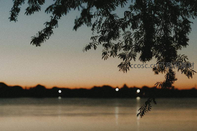 黄昏湖畔,枝叶剪影映霞光