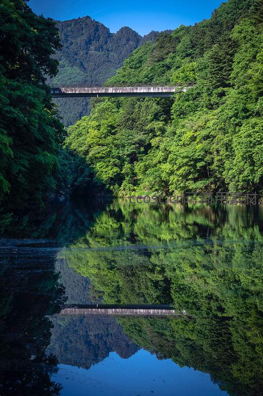 青山环抱,碧水如镜,一座小桥横跨山谷,两岸葱郁林木与桥身完美倒映水中,构成对称和谐的自然画卷。