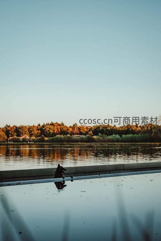 清澈的湖面如镜,倒映着远处金黄的树林和澄澈的蓝天。近处石阶上一个模糊的剪影静坐,与水中倒影相映成趣,整个画面弥漫着秋日午后的宁静与安详。