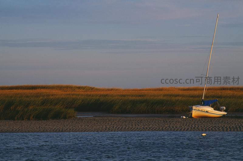 金色夕照铺满芦苇荡,一叶孤舟停泊在浅滩,水面微波轻漾,天空渐染暮色,营造出安逸闲适的黄昏意境。