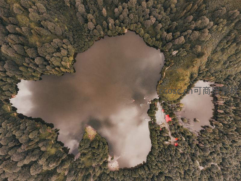从高空俯瞰,浓密森林怀抱幽深湖泊,湖畔几座红顶小屋点缀其间,薄雾缭绕水面,宛如秘境中的世外桃源。