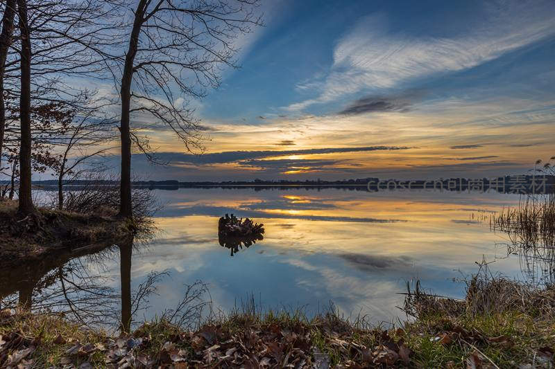 夕阳西下,天空被染成金黄与淡蓝交织的画卷,平静湖面完美倒映着天光云影。岸边枯树静立,落叶铺地,尽显秋日湖畔的静谧之美。