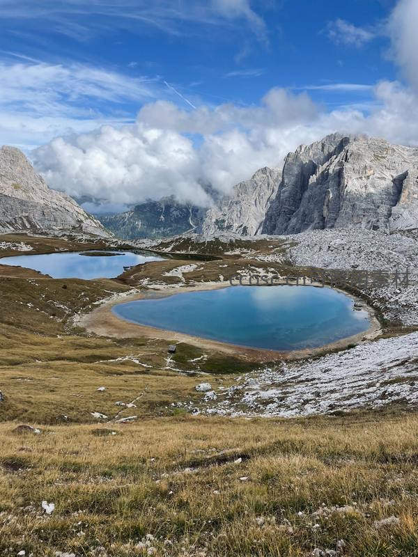 巍峨的石灰岩山峰直插云霄,山脚下两汪清澈如镜的高山湖泊静静躺卧。湖水映照蓝天白云,周围是枯黄草甸与零星积雪,壮丽而纯净。