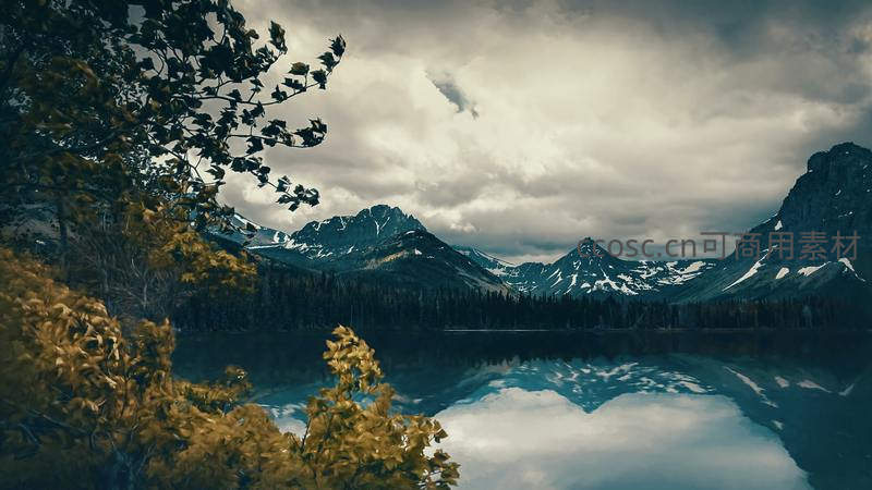 湖边金黄树叶随风摇曳,远处雪山巍峨耸立,云层低垂,湖面完美倒映山峦轮廓,构成一幅冷暖交织、层次丰富的秋日山水画。