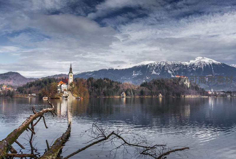湖中孤岛上的白色教堂尖顶直指天空,背景是白雪覆盖的雄伟山脉,前景枯枝横斜,构图富有层次,融合人文与自然的和谐之美。