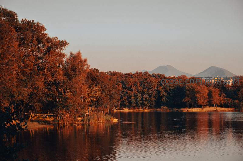 秋日暖阳下,湖边树林披上绚烂红装,倒影在波光粼粼的水面摇曳生姿,远处山峦与建筑在柔和光线中更显宁静致远。