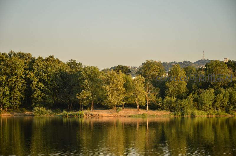 阳光明媚的午后,湖岸绿树成荫,枝叶倒映于清澈水面,远方山丘上点缀着建筑与信号塔,展现自然与都市和谐共存。