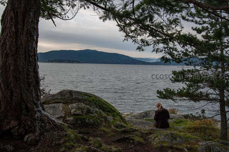 一位女子坐在长满青苔的湖边岩石上,透过松树枝叶眺望对岸连绵山脉,湖面微澜,氛围宁静深邃,充满哲思与自然交融的意境。