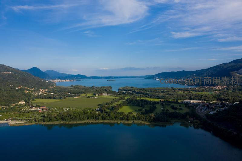 高空俯瞰碧蓝湖泊与翠绿山丘相映成趣,田野村庄点缀其间,云卷云舒,展现大地壮丽而和谐的生态画卷。