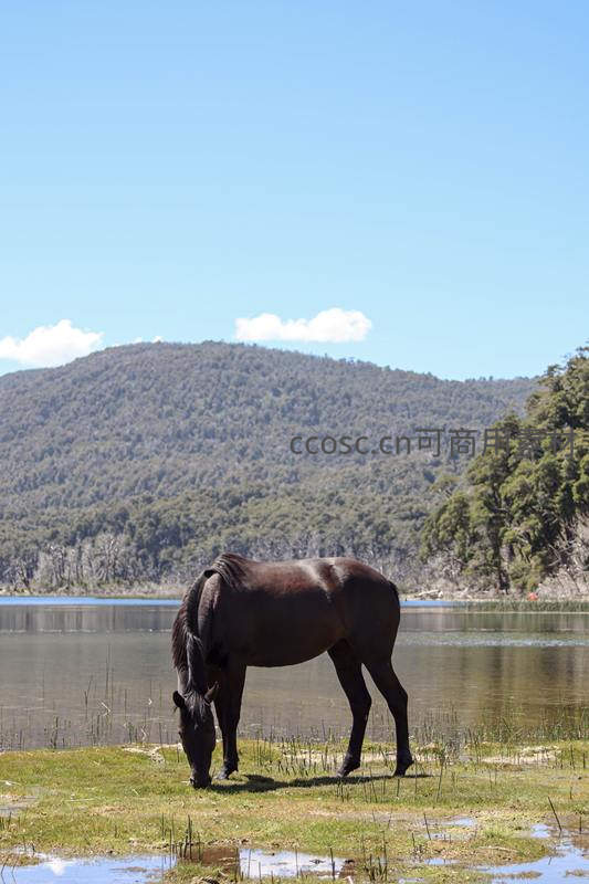 一匹黑马在湖边湿地低头觅食,身后是苍翠山峦与澄澈湖水,阳光明媚,画面充满田园牧歌般的悠闲与生机。