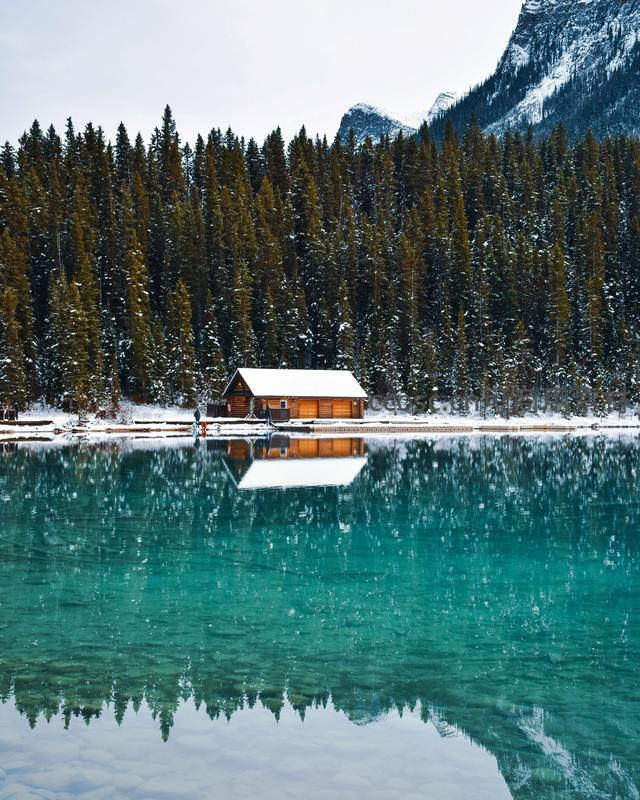 一座温暖的木屋静立于碧绿湖畔,白雪覆盖屋顶与森林,湖面如镜完美倒映山林,营造出超现实的宁静与和谐之美。