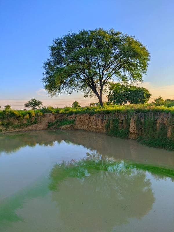 一棵枝繁叶茂的大树伫立在河岸土坡上,清澈的水面倒映着树影与蓝天,夕阳余晖洒落,营造出宁静祥和的田园氛围。