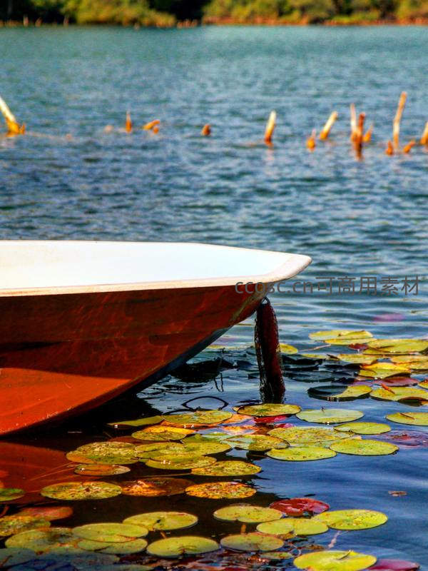 一艘木质小船静静停泊在布满荷叶的湖面上,阳光透过树叶洒下斑驳光影,远处隐约可见水生植物,营造出悠闲惬意的夏日氛围。