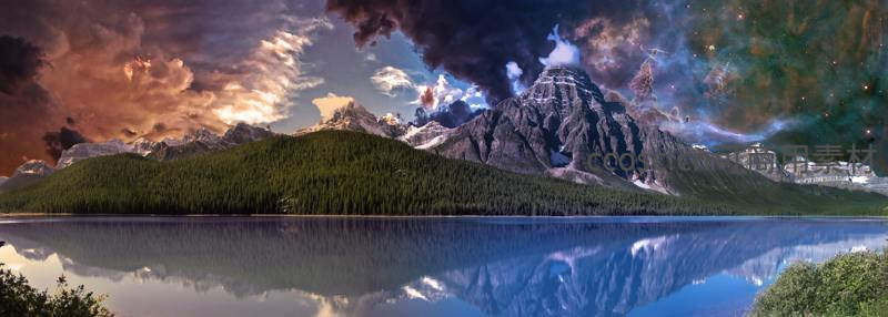 壮丽雪山倒映在如镜湖面,天空云层翻涌,星云幻境点缀天际,营造出超现实的自然奇观,令人叹为观止。