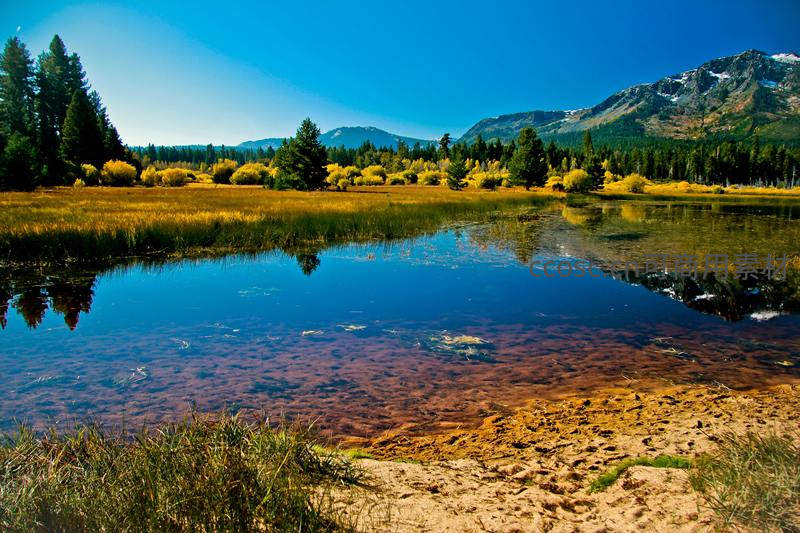 清澈湖水倒映着金黄与翠绿交织的林木,远山隐约,蓝天如洗,湿地边缘沙土与草丛相接,尽显秋日静谧之美。
