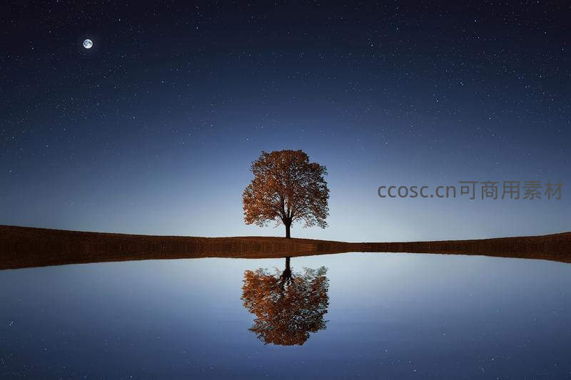 孤树月夜水中倒影